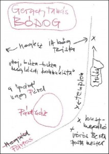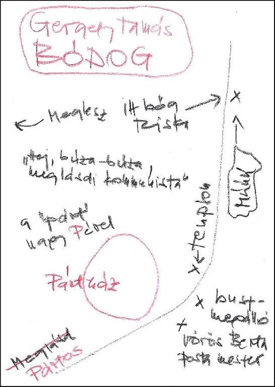 Természetesen a tervből semmi nem lett. Egyrészt nem tudok én olyat írni, másrészt és főként: nem mertem. Tudom, hogy rájöttek volna, és nagyon visszavágott volna a szatíra, közelebbről megismerkedhettem volna a Szekuval, és hát velük nem lehetett viccelni! Ez, hogy kérdésedre visszatérjek, a tervezett szöveg nem a szatirikus kisregény ötlete, viszont most, hogy a szöveg kész, mondhatom, hogy a Bódog előtörténetéhez tartozik.