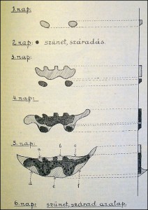 Ötödik nap. Megkaptam a magyarázatot. Reggeltől kezdve szorgalmasan és csendesen épített, pedig nemcsak úgy, hogy a simán ráragasztották a sarat, hanem az építményt alul vastagítani, kifelé építeni kezdték, amint a rajzon az oldalméret mutatja. Meg kellett tehát várni, míg az előző napi rakás keményre szárad, hogy bírja a reáragasztott vastagabb réteg súlyát.