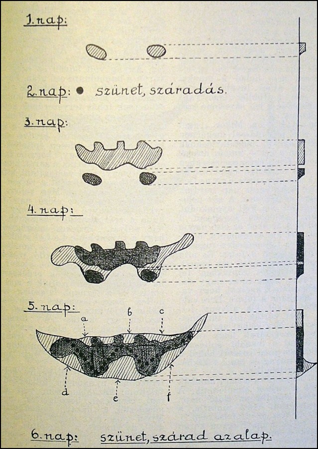 Meg kellett várni míg az állvány megszárad, hogy rá lehessen állítani a további építésnél, mert röptében igen rosszul halad a munka, sok anyag és munka kárbavész, sok sár lehull. Az esti helyzetet s a napi munkák haladását a rajzok szemléltetik. A fekete rész mindig a előző napi, már megszáradt rész mutatja, a vonalkázott rész az új felrakást.