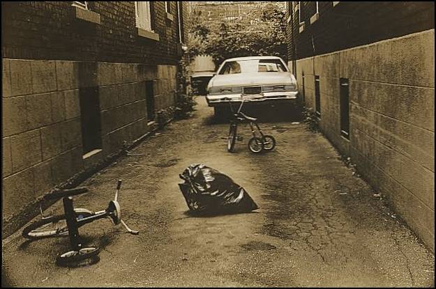 A zsákutca alkotó elemeit – az elhagyott, várakozó járművek, a kép középpontjában díszelgő, fényes szemeteszsák, a masszív, fölénk emelkedő falak vonalai, a háttérbe futó párhuzamosok – bármikor meg lehet komponálni, el lehet képzelni, majd megörökíteni, de ez nem ugyanaz, mint amit e kép sugall.
