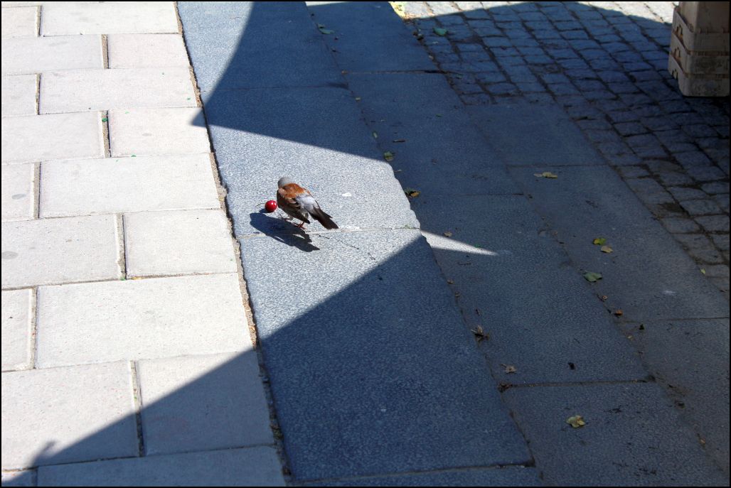 Úgy tűnik, a csipegetők gyakori vendégei a standnak, mert ma a kenyérbolt felé mentemben azt látom: áll az eperrészleg mellett az árus, és… úgy értelmezem, dob az aszfalton izgő-mozgó seregélynek. Meglepődöm: ezek szerint elve, hogy minden éljen, ember, állat. Ám abból, ahogyan a következő eperszemet röpíti, rájövök, hogy kő helyett dob valószínűleg romlott/túlérett eperrel, és a madarat nem etetni, hanem megsebesíteni akarja. Legalábbis megijeszteni…