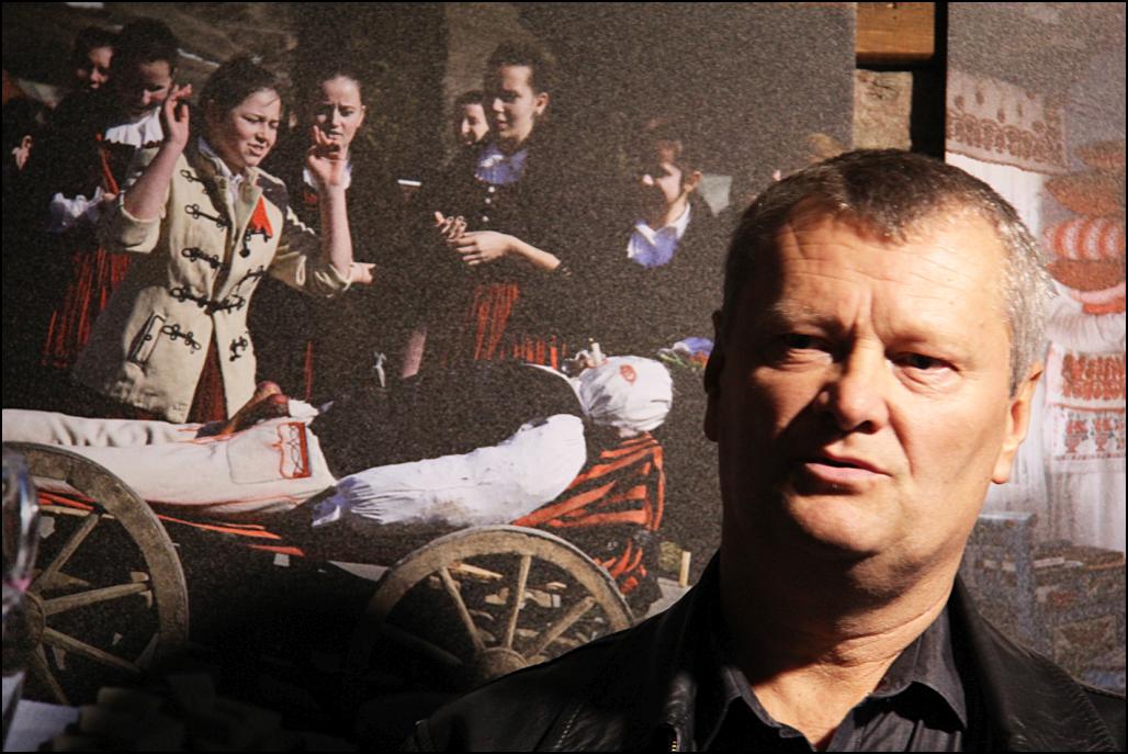 A Marosvásárhelyi Marx József Fotóklub bemutatkozása Szebenben 2014 november 13-án. A képen Both Gyula a fotóklub elnöke, háttérben a farsangtemetésen készült felvétele.