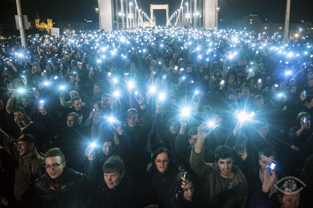 A legjobb hírképért * Netadó-tüntetés * Az Erzsébet hídon vonuló több tízezres tömeg egyszerre tartja a magasba mobiltelefonjait az internetadó elleni tiltakozásként 2014 október 28-án.