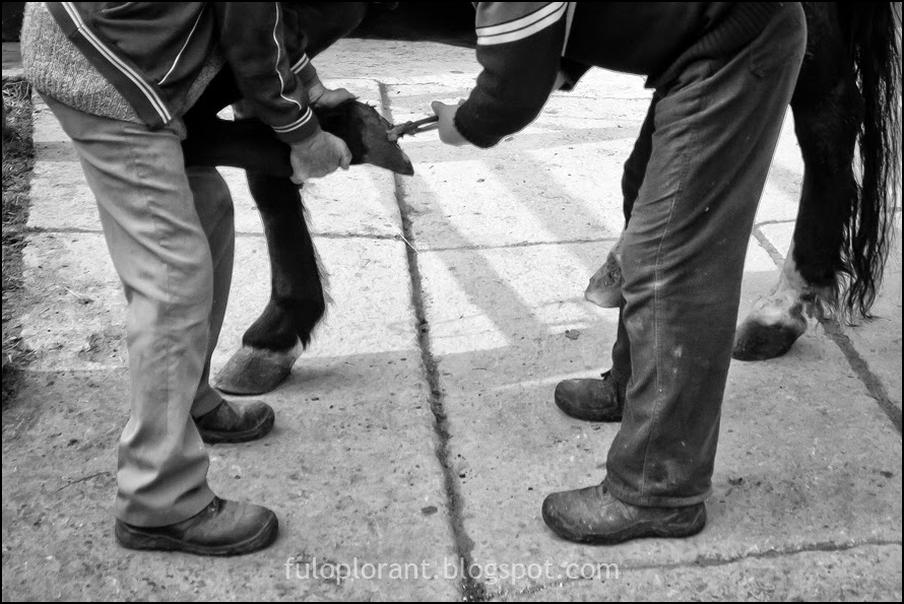 Ez lópatkolás, illetve annak a bevezetõ része, amikor a ló patáját lepucolják, s levágnak a végébõl. A kovácsnak bõr surca szokott lenni…