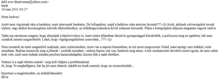 Nem mutatok én mást magamból senkinek, nem színészkedem, most van a napom lemenőben, és ezt most megosztom Veled, mást amúgy sem érdekel, mint mondtam. Bajban ismerszik meg a jóbarát – szokták mondani – nekem bajom sok van, barátom meg nincs. A két unokaöcsém távolról szeret ugyan, de nem sokat érek vele, mert nem tudnak minden percben hazaszaladgálni, hiszen élik a saját életüket.