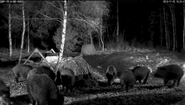 Számitógépes fénykép egy észtországi vadkamera 2015. november 25-i, esti élő felvétele alapján: vadlamackonda a vadetetőnél sárgarépát esznek