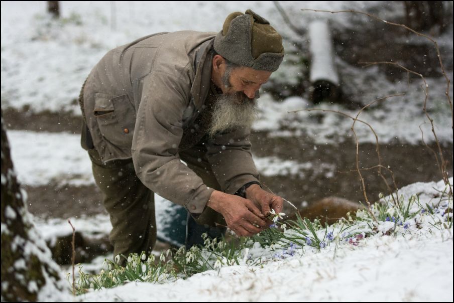 Gyugyu (Tankó Fülöp), a gyimesfelsőloki “adatmondó” az idei áprilisi hó alatt is rátalált korán kinyílt virágaira