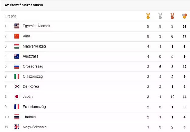 (Triplázás) Hosszú Katinka harmadik aranyérmét 200 méter vegyesen nyerte a riói olimpián. „Még mindig nem fogom fel, hogy háromszoros olimpiai bajnok vagyok. Mondjuk, az volt a cél, hogy úgy ússzak itt, mint egy átlagos versenyen” – mondta, annak ellenére, hogy saját bevallása szerint amit lehetett, mindent elrontott 200 méter vegyesen, példaként említette a fordulókat és a rajtot. „Nagy szerencse és a sok munkának köszönhető, hogy így is nyertem.” Ez volt különben a magyar küldöttség hatodik érme, közte a negyedik aranya. (Atv.hu)