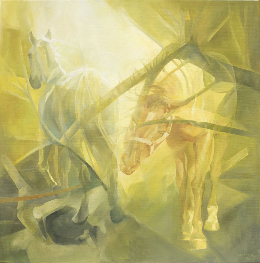 Xantus Géza sárgás-barnás, árnyalatokban oly gazdag színvilágával, és a rá jellemző, szétbontott-sokrétű fényérzékelésben most szokatlanabb témát választott.