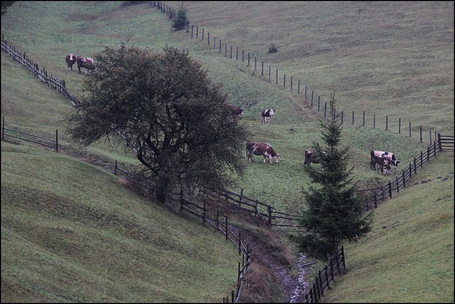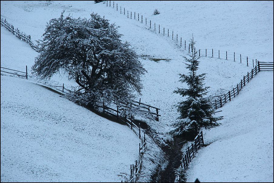 2016. október 29-én szürkület előtt a zöld mezőn még legelésztek a tehenek, de másnap reggelre hó borította a tájat a Gyimesekben, Borospatakán