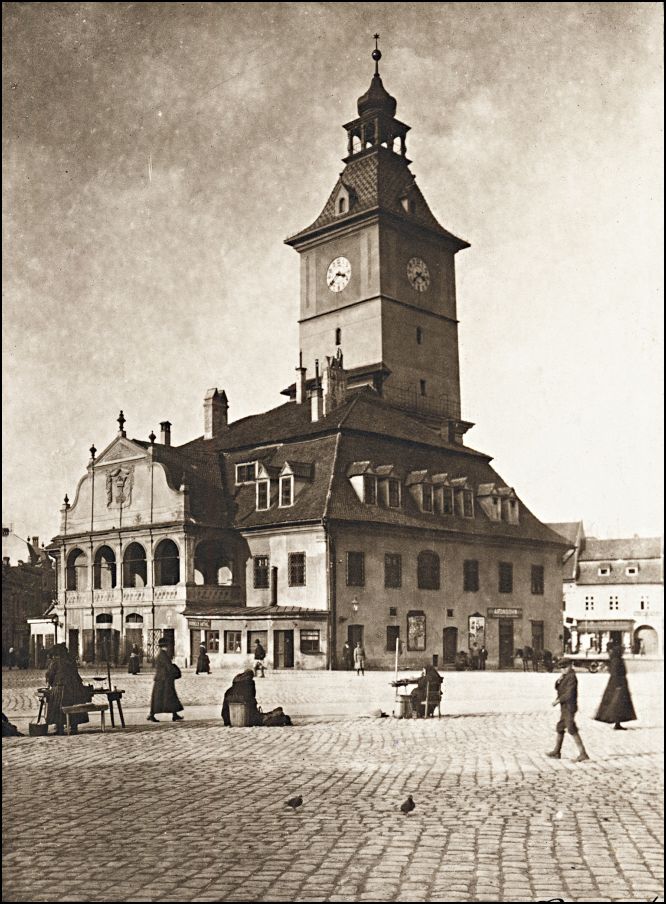 A Főtér négyszögébe szorítva, zajos és tarka összevisszaságban sietnek az emberek, de közöttük nyugodt és megingathatatlan toronyként emelkedik a tanácsház. Eleinte csak erős kőtorony volt, amely a város szélén elterülő piaci sokaság felett valósította meg a tanácsurak rendet kívánó akaratát. Erkélyén a vásárbíró ült, ki vigyázva figyelt a lábánál zajló tömegre és csatlósaival szoktatta rendre az izgága vásári népet. Lassanként a torony körül épület emelkedett. A vastag falú, apró ablakú toronyban már ötszáz évvel ezelőtt is éppen úgy ülésezett a városi tanács, mint ma. A torony is magasabb lett s egy segesvári „Stundenmacher” órát is készített rá. Az épület úgy áll a zajgó piac közepén, mint egy darab hatalmas és ma is élő múlt, erkélyének lágy félkörívein nyugalom és okos célszerűség honol. Súlyos testét valami komoly méltóság teszi kedvessé, a megbékélt és nyugodt érettség méltósága. Még az is tisztelettel néz rá, aki minden meggyőződésével az új tárgyilagosságra esküszik. De még e méltóságos épület sem kerülhette el a rosszul újítók kegyelet nélkül átalakító kezét, egy negyedszázaddal előbb a régi, kecses tetőzetet holmi szecessziós cserép-költeménnyel cserélték ki és alig egy éve, hogy falait barbár meszelő kente világossárgára. Azonban érintetlenül maradt a város címere, habár kékkel és arannyal kissé rikítóra festették is át. Felette az Isten szeme vetíti szét sugarait a rejtelmes háromszögből, a címerre vigyáz talán s a címerben Brassóra. A jelképes címer is talál hozzánk, levágott fatörzs, melyen királyi korona nyugszik. A címert bizonyára a város német és latin nevéhez készítették a humanista iskola tudós tanárai, talán éppen maga Honterus… De ezt csak a józan lelkek képzelik így, a kegyeletes rege mást mesél. Bájos és mélységesen szép rege ez, szinte hihetetelen, hogy Brassó talajából sarjadt volna ki. Úgy emlékszem, hogy összesen két mondát találtam e városban, az egyiket elmondtam már és most elmondom a másikat is, talán csak a magam mulattatására, mert a komoly brassói polgárok még e két regében sem hisznek.