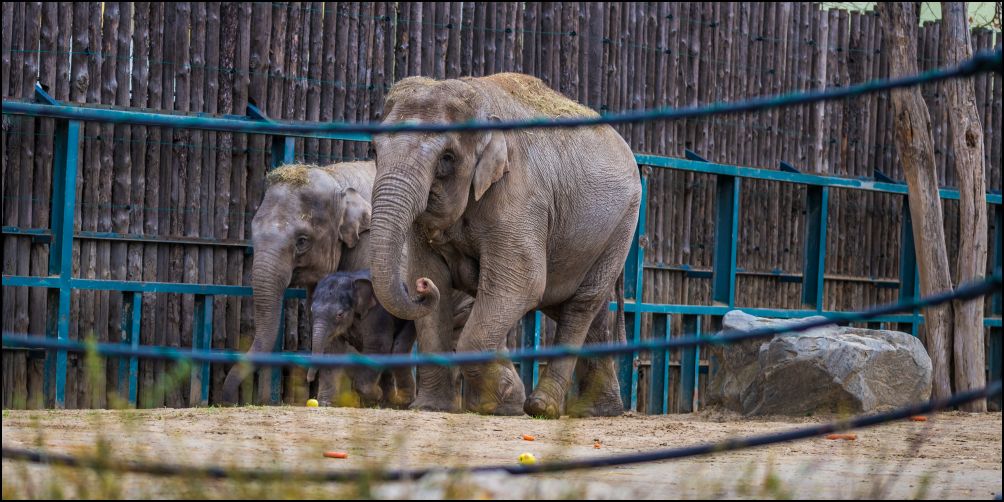 Arun, a nemrég született kiselefánt, anyja és testvére gondos takarásában a Budapesti Állatkertben, 2017