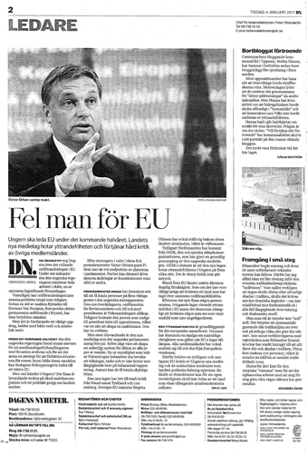 Kávézás közben kinyitom múlt kedden a napilapom (Dagens Nyheter, 2011-01-04) s hát mit látok, a második oldalon – Orbánt. Orbán Viktor magyar miniszterelnököt. Öklömnyi cím a kép alatt: ”Fel man för EU” – magyarra hogyan is fordíthatnám? ”Téves személy az EU-ba”? A lényeg: kétharmados parlamenti többségét a Fidesz-kormány úgy használja ki, hogy egyre több hatalmat összpontosít a saját kezében, hogy a hozzá lojális személyeket választ a kulcspozíciókba és ami a legsúlyosabb – a Dagens Nyheter szerint – ellenőrzése alá veszi a médiákat.