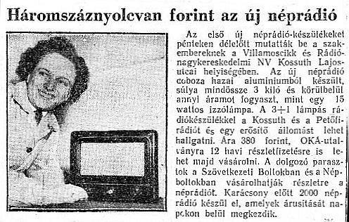 Ugyanolyan, amilyen nálunk is szólt, reggeltől estig. S már nem ’telepről’: villanykonnektorból… A vidám népfiak (a szövetkezeti paraszt kalapban, a nagyipari munkás sildes sapkában) boldogan mennek hazafelé /balról a falu, jobbról a gyár/: mától a kultúra is eljött házukba a villanyhoz … E kultúra szolgálói lettek a ’rádiósok’ – köztük egy ideig magam is…
