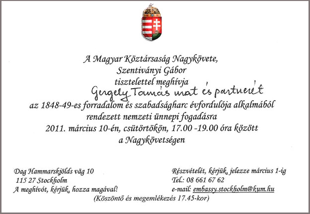 Meghívó érkezik a Magyar Köztársaság stockholmi nagykövetétől, melyben ”az 1848-49-es forradalom és szabadságharc évfordulója alkalmából rendezett nemzeti ünnepi fogadásra” invitál.