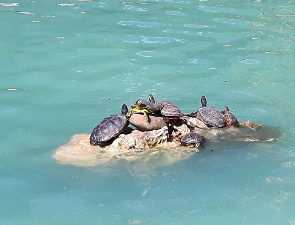 A portugáliai Cascaisban gyakorta megfordultunk Évával a városi parkban. Annak egyik érdekessége a mesterséges tó, melyben kacsák élnek és ezek a kis méretű napimádó ékszerteknőcök*, még a fejük is felemelik, hogy többet kapjanak az életet jelentő napsugárból. (Kép és szöveg: Gergely Tamás)