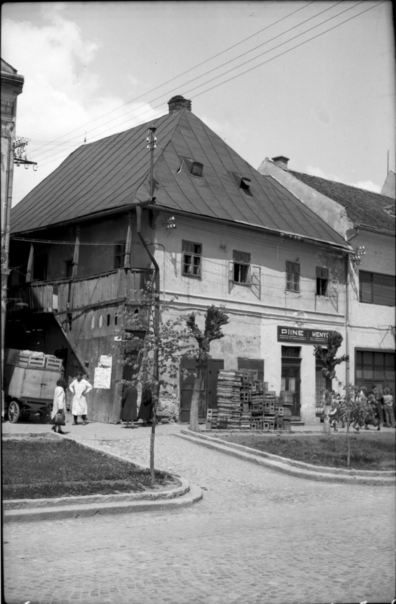 Kriza János Néprajzi Társaság fotóarchívuma / Régi épület, oldalán egy udvartér bejáratával. „(…) a főtéren a XIX. sz. végén a polgáriasodás igényeinek és ízlésének megfelelően nagyrészt emeletes kőházak épültek (…)”* Forrás: maszol.ro